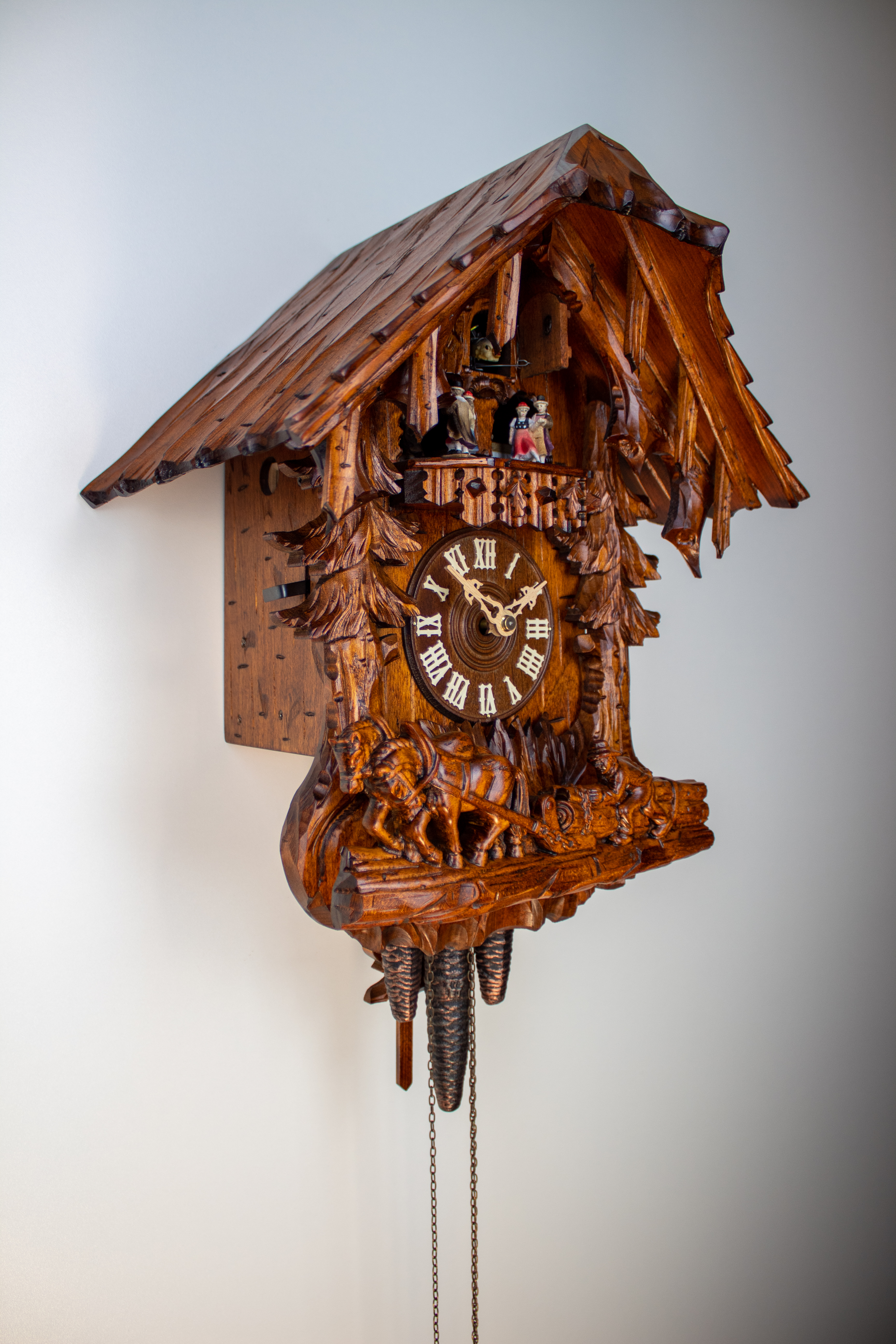 1 Day Music Dancer Cuckoo Clock Black Forest House with farmer and working horses