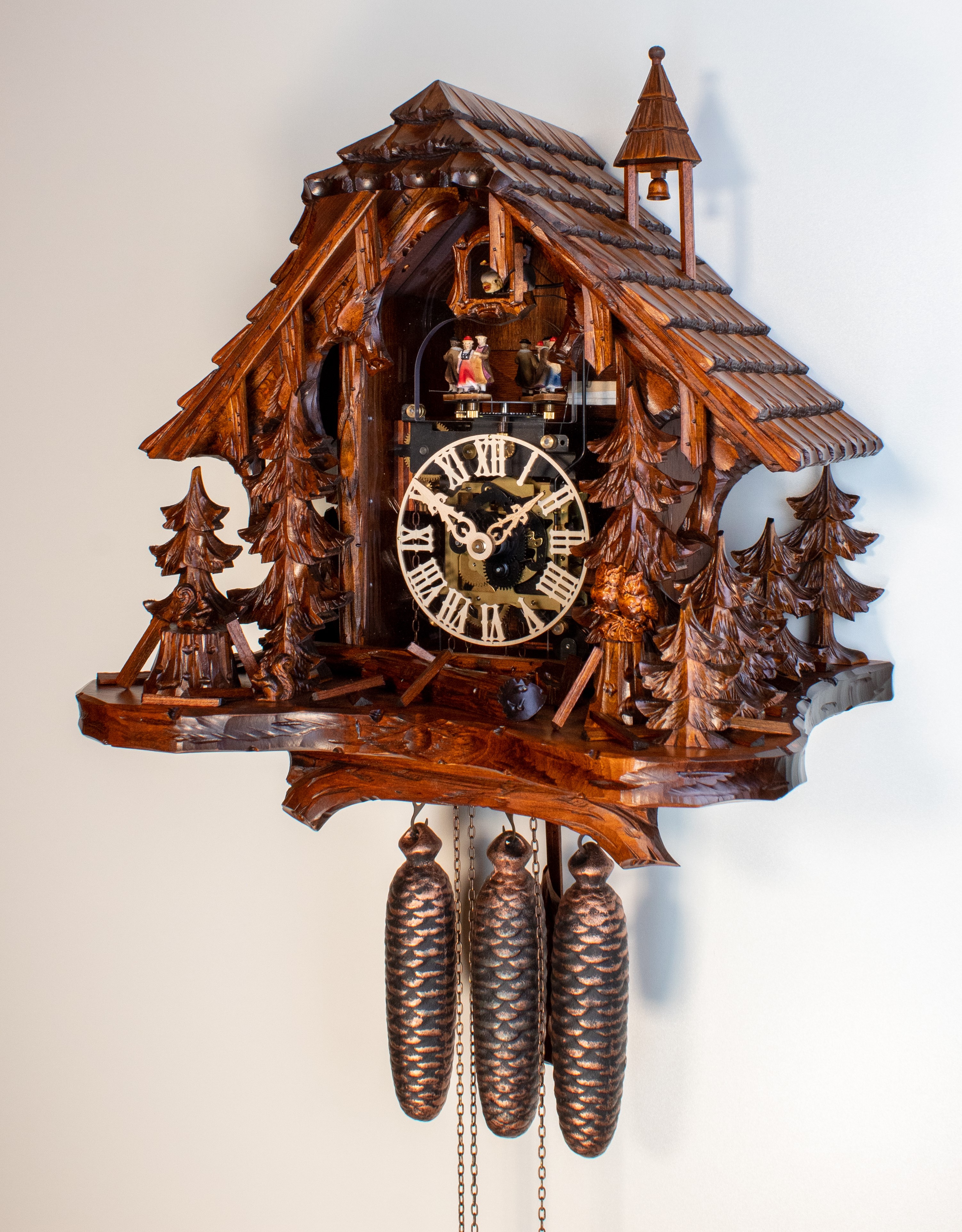 The solid-wood cuckoo calls the number of the hour on every full hour and once on the half-hour. The cuckoo flaps his wings as he calls.